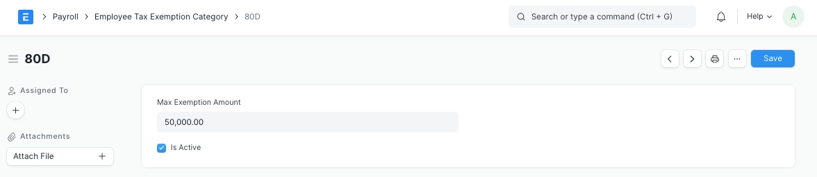 Exemptions from taxable salary are usually restricted to spendings on particular categories decided by the Government or regulatory agencies. Frappe HR allows you to configure various categories which are allowed to be exempted. Examples of these (for India) could be, 80G, 80C, B0CC etc.