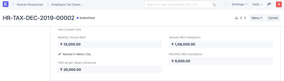 As part of the Employee Tax Exemption Declaration, employees can also fill out the HRA Exemption. Frappe HR calculates the exemption eligible for HRA and exempts it while calculating the taxable earnings.