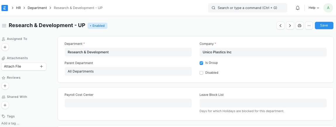 > Note: The 'Is Group' checkbox needs to be checked if the Department is a parent department.