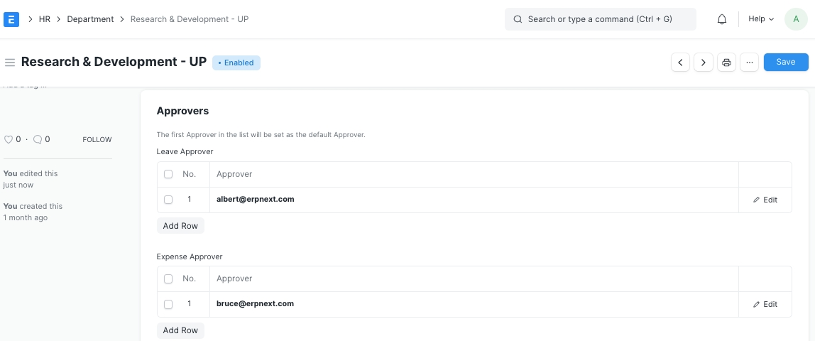 > Note: Multiple Leave and Expense Approvers can be set for a particular Department. However, the first Approver in the list will be set as the default Approver.