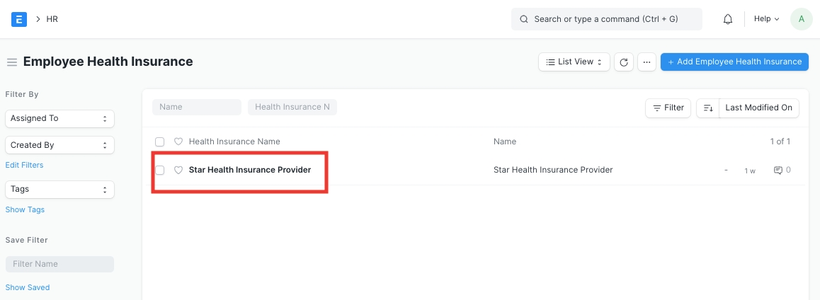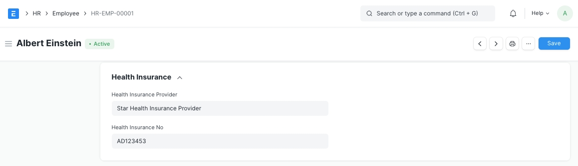 Frappe HR allows you to save the Employee Health Insurance detail and link it to that particular Employee's master.