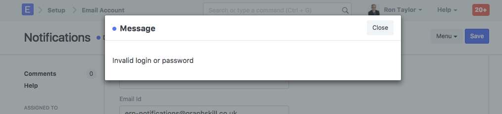 This indicates that using login credentials and other email gateway details provided in the Email Account, Howinibs is not able to connect to your email server. Please ensure that you have entered valid email credentials for your Email Gateway. Once you have configured Email Account successfully, you should be able to send and receive emails from your Howinibs account fine.