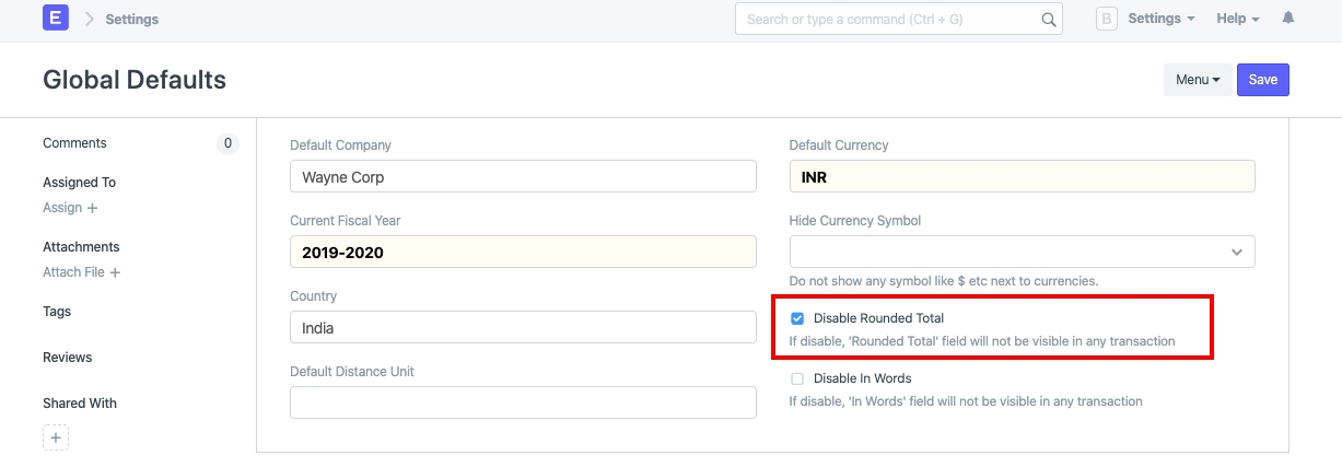 In Sales Invoice, in-words in being printed with the rounding off even though it is disabled via Global Defaults.In the Global Defaults one can always Disable Rounded Total via the following checkbox: