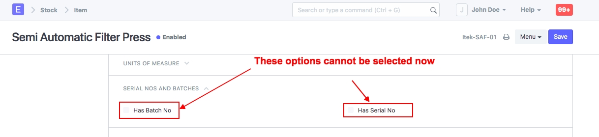 You can read more about why the same is disabled here. To enable the options again, you can either delete all stock transactions for this item, or if that is not an option, you can duplicate the same item and inward the stock with these options checked. STEPS: