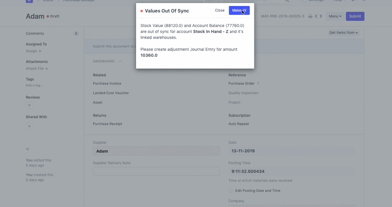 To proceed forward, you can easily sync the stock balance and stock accounts balance by creating a Journal Entry. Click on “Create a Journal Entry Button“ in the validation message, update relevant accounts and submit Journal Entry.
