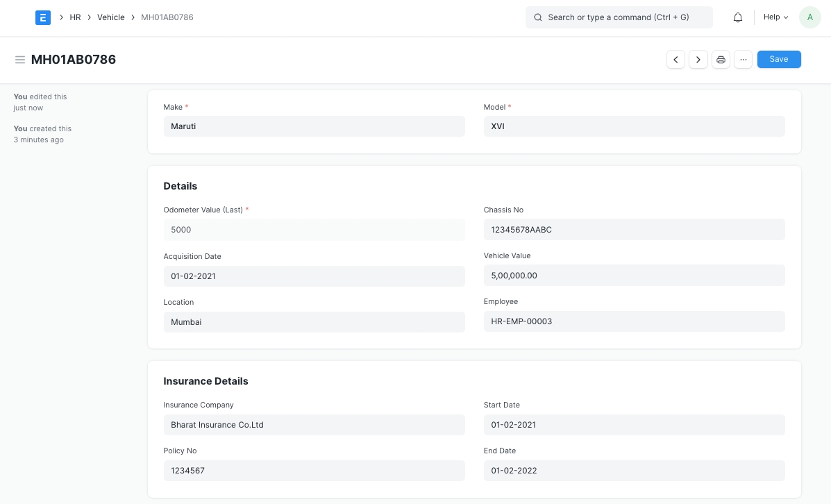 Additional Vehicle details such as Chassis No., Acquisition Date, Vehicle Value (Amount), Location, Employee managing the Vehicle and Insurance details can be captured in the Vehicle master.