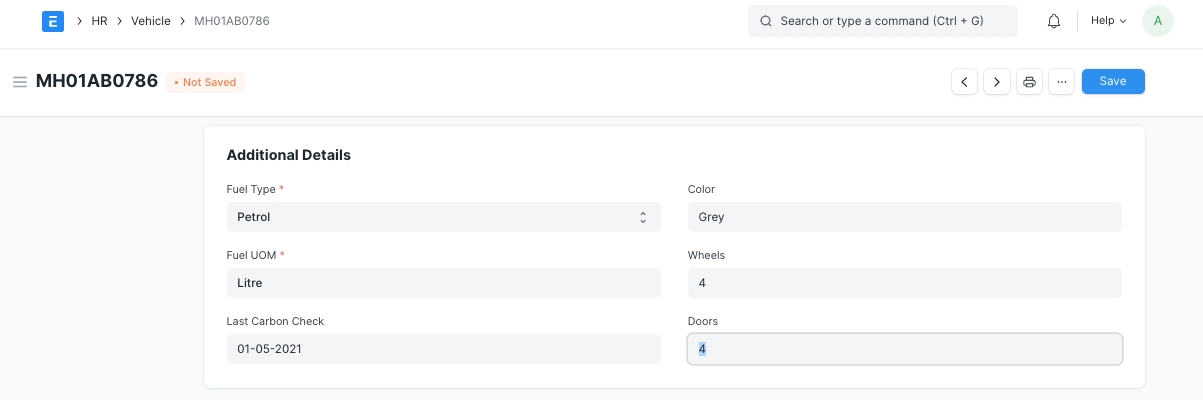 Additionally, Vehicle attributes like Color, Wheels, Door, Last Carbon Check, Fuel Type and UOM can be saved in the Vehicle master.