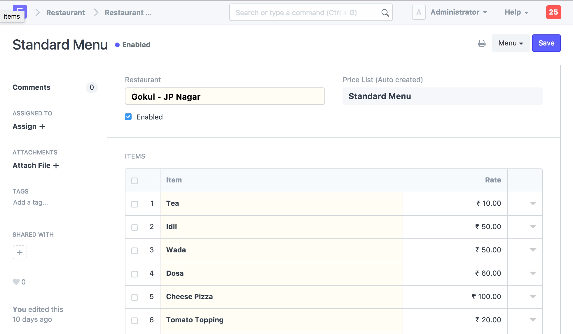 For every restaurant you must set an active Restaurant Menu from which orders can be placed. You can also set the rates for each of the item for the day.