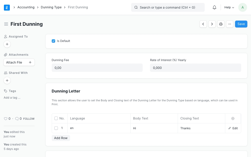 Dunning Type stores default values for dunning fee, interest rate and text blocks to be included. For example, a Dunning Type "First Notice" will not have any fees, but Dunning Type "Second Notice" will have a dunning fee and interest charged on the outstanding amount.