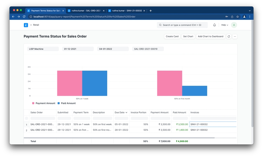 Report to calculate status of Payment Terms based on the invoices created against that Sales Order. Invoice amount is split into the respective payment terms at runtime using FIFO method.