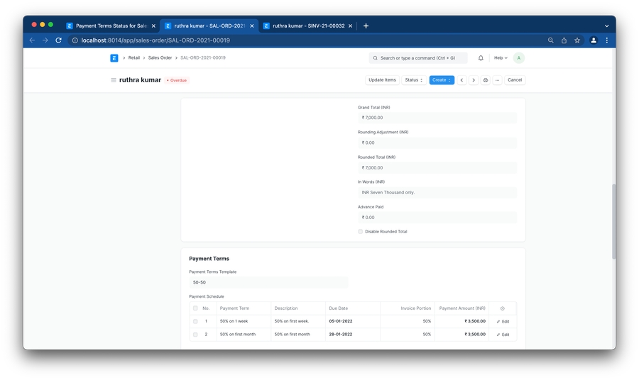 Consider a Sales Order with total value of 7000₹ and a payment terms of 50-50.
