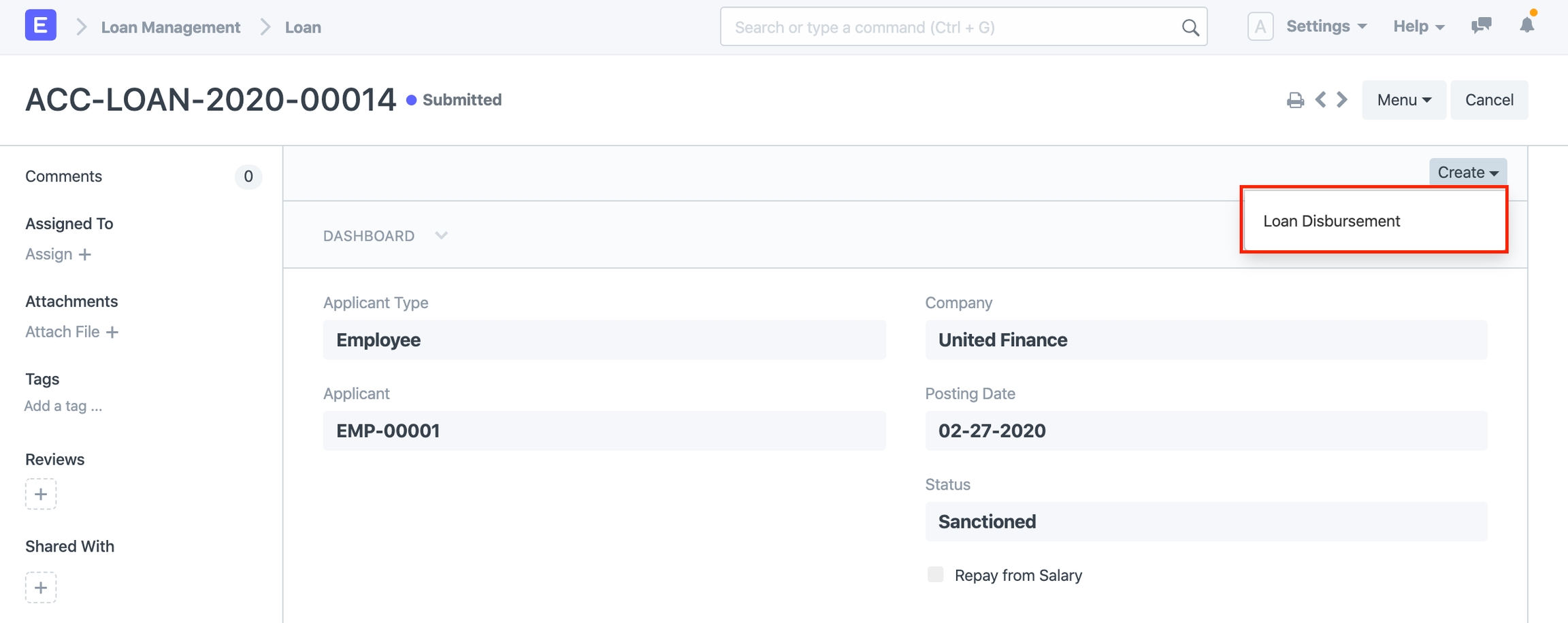 You can also create a Loan Disbursement from a sanctioned Loan via the Create button on the top right