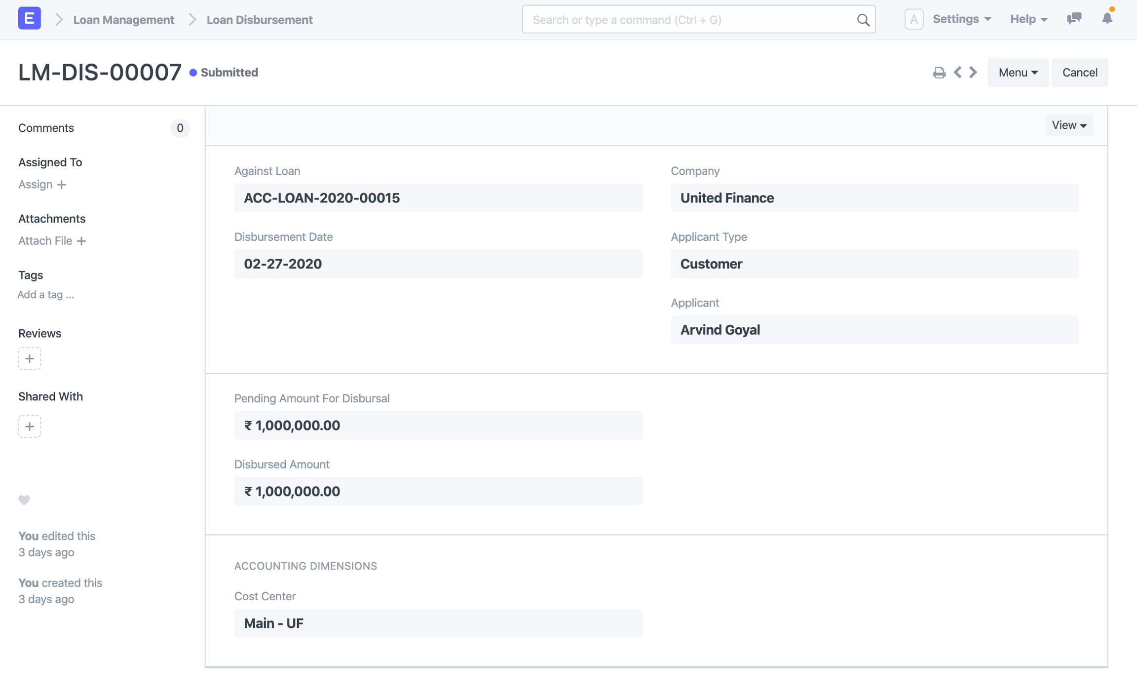 Once a Loan is sanctioned, the loan amount is ready to be disbursed. For that, a Loan Disbursement entry is created.