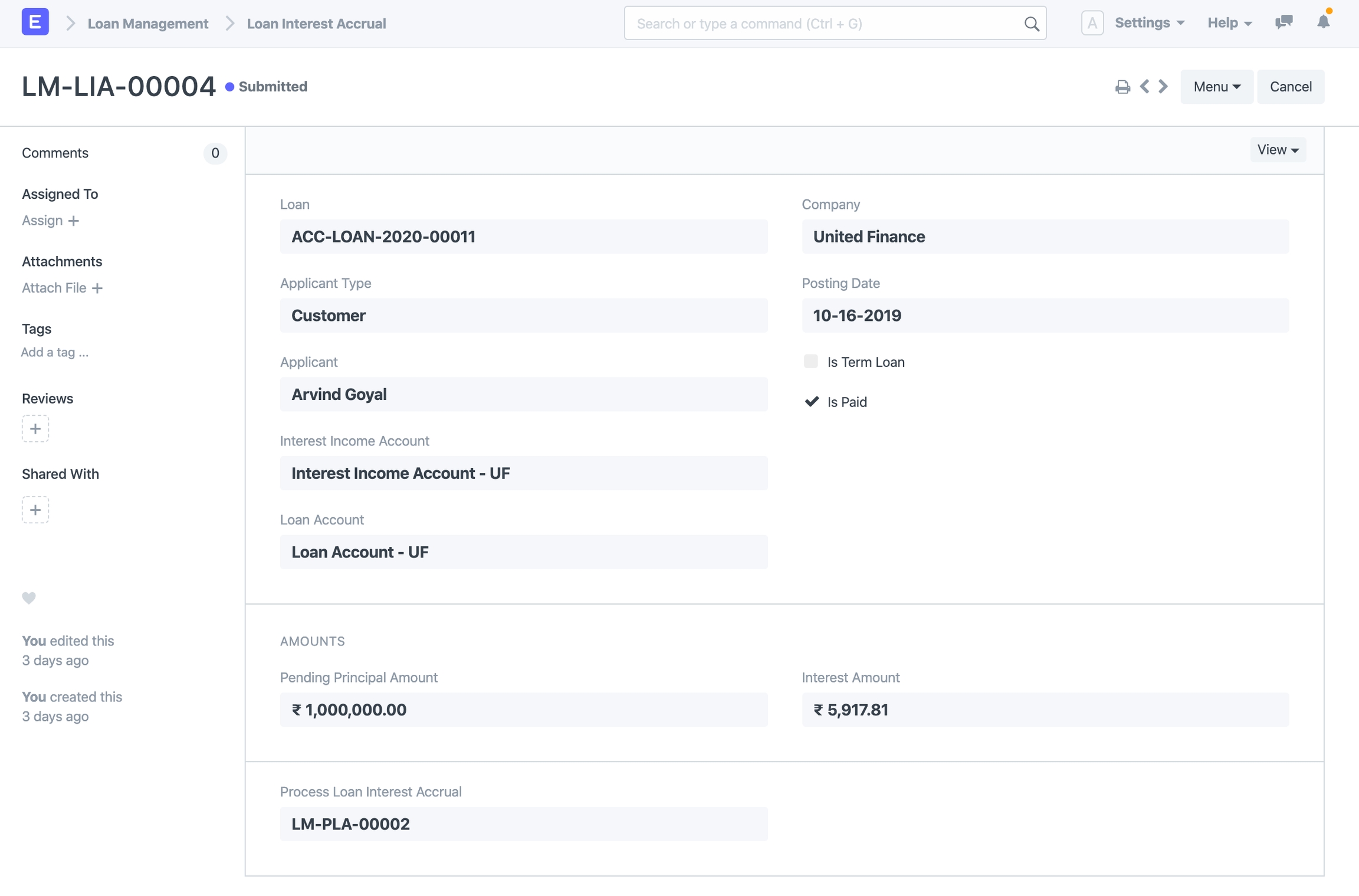 Is Paid: Is paid checkbox indicates whether the accrued loan interest has been paid or not