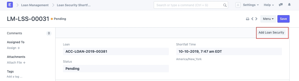 To access the Loan Security Shortfall list, go to: > Home > Loan Management > Loan Security > Loan Security Shortfall