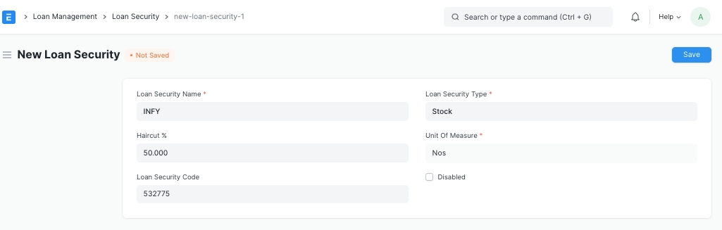 During a loan process, if the loan for which the applicant is applying is a secured loan then some kind of security needs to be pledged against that loan. In Loan Security Type master you can define that type of security.