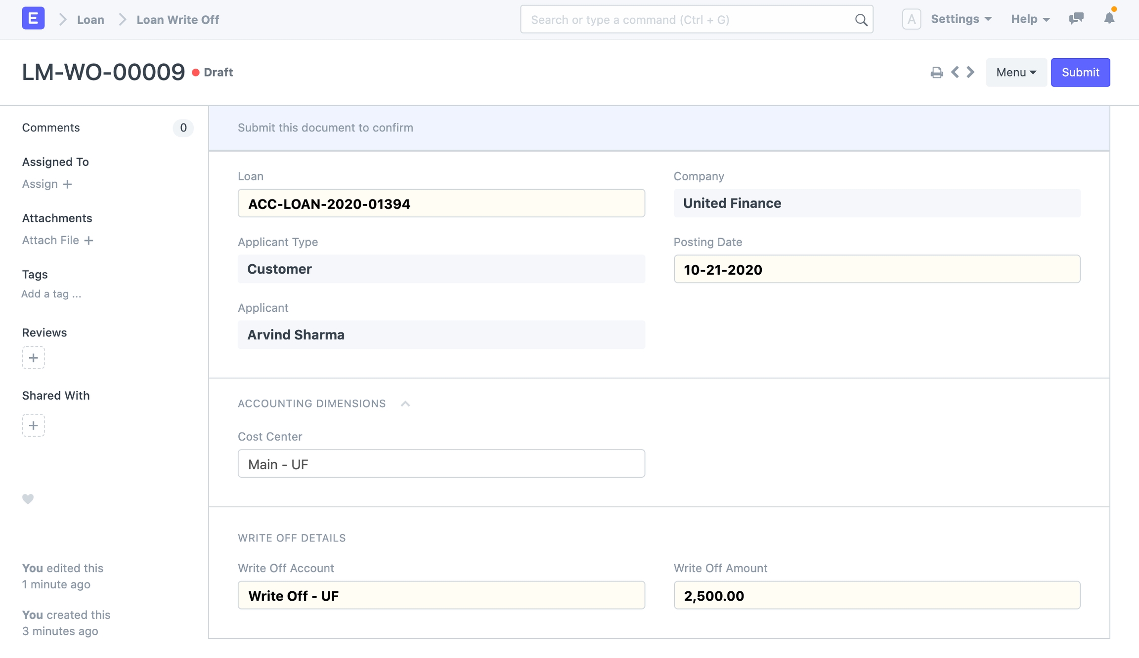 Click "Submit" to submit the Loan Write Off entry.
