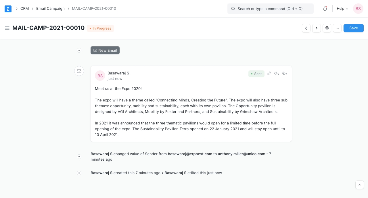 When emails are sent to the respective leads or contacts, Communication is linked to the Email Campaign document. You can view all the emails sent in your document.