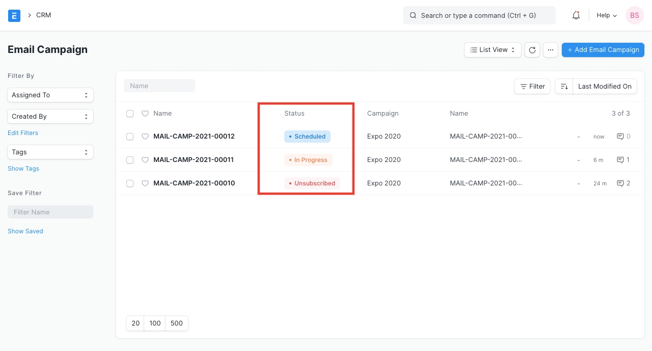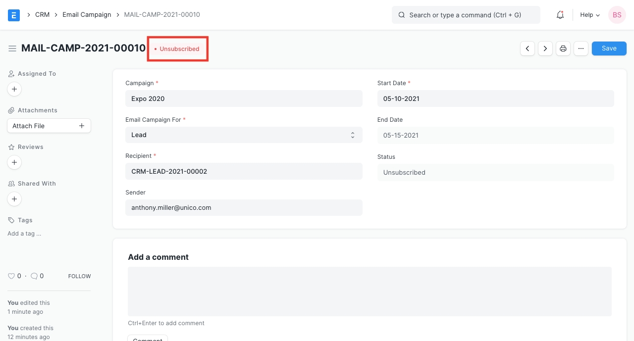 When the lead or contact unsubscribes, the status of the Email Campaign document changes to 'Unsubscribed'.