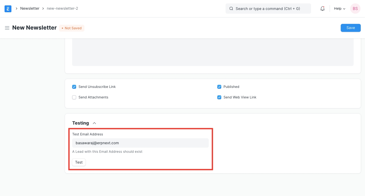 Once the newsletter is ready you can provide a 'Test Email Address' and click on 'Test'.