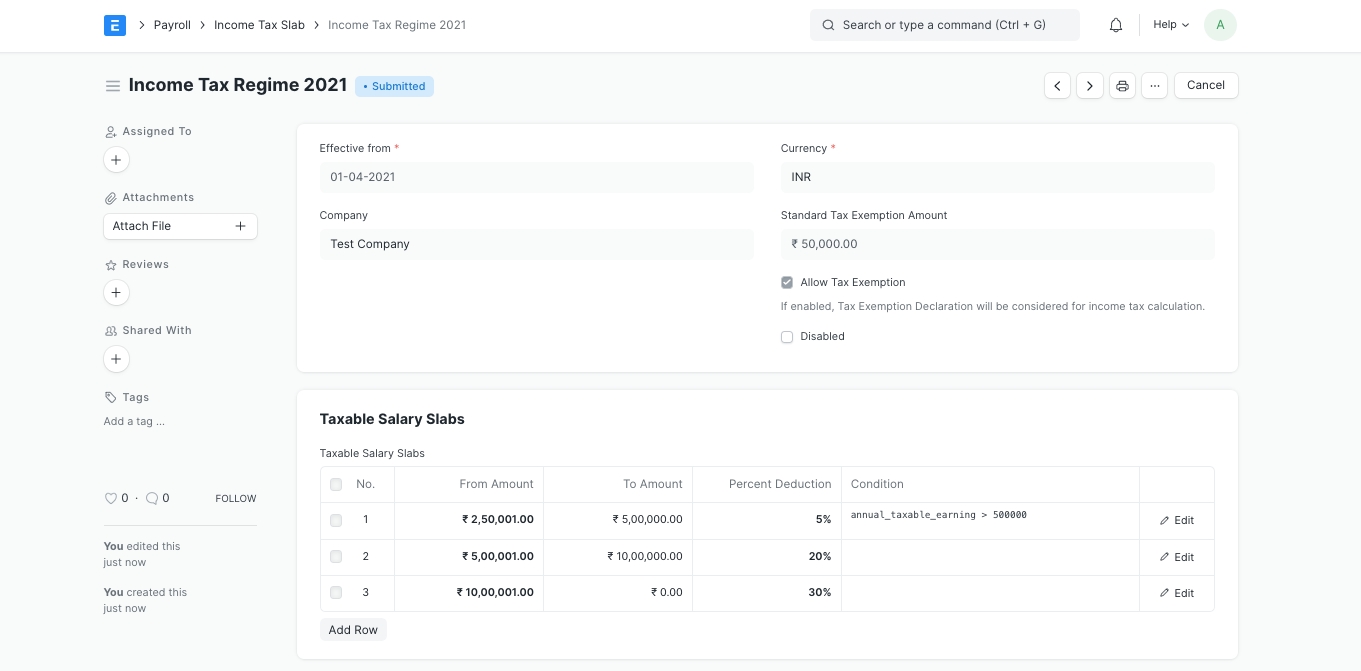 In many countries, income tax is levied on individual taxpayers based on a slab system where different tax rates have been prescribed for different slabs and such tax rates keep increasing with an increase in the income slab. In Frappe HR, you can define multiple Income Tax Slabs and link them to individual employee's salary structure via Salary Structure Assignment.