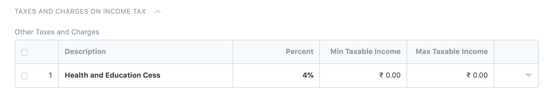 If other taxes are applicable on calculated income tax, you can enter those using this table. You can also define the min and max taxable amount for which this tax will be applicable. For example, Health and Education Cess is applied additionally on income tax to everyone in India.
