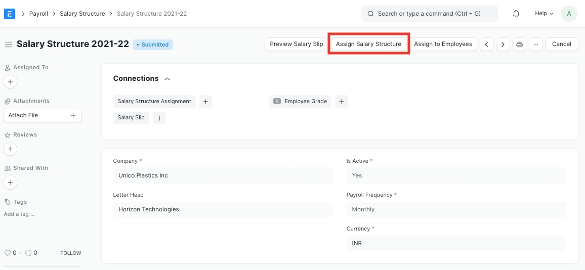 If you want to bulk assign the Salary Structure to multiple employees, you can do so via the 'Assign to Employees' button.