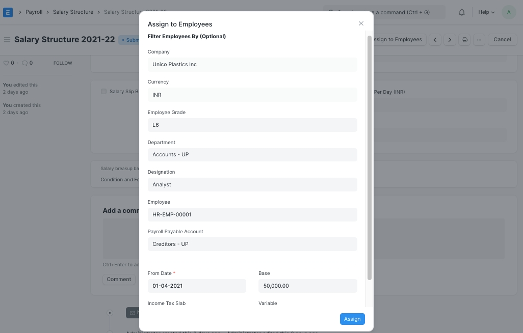 Once this is done, click on the 'Assign' button to assign the Salary Structure accordingly.