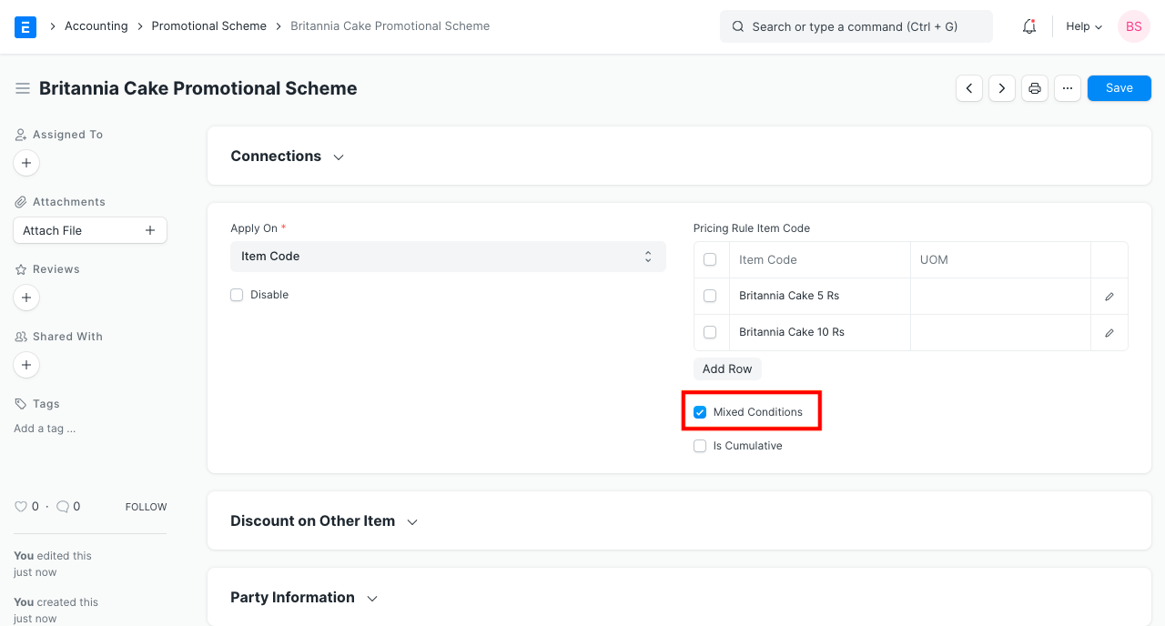 Apply Rule On Other as Item Code and set Item Code as Britannia Cake 15 Rs.