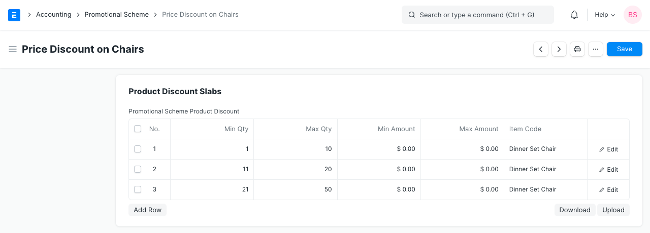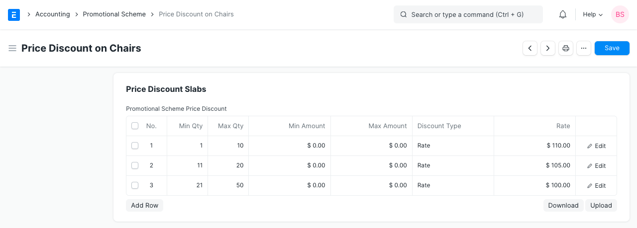 In the Price Discount Slabs table, set the price discount, product discount.