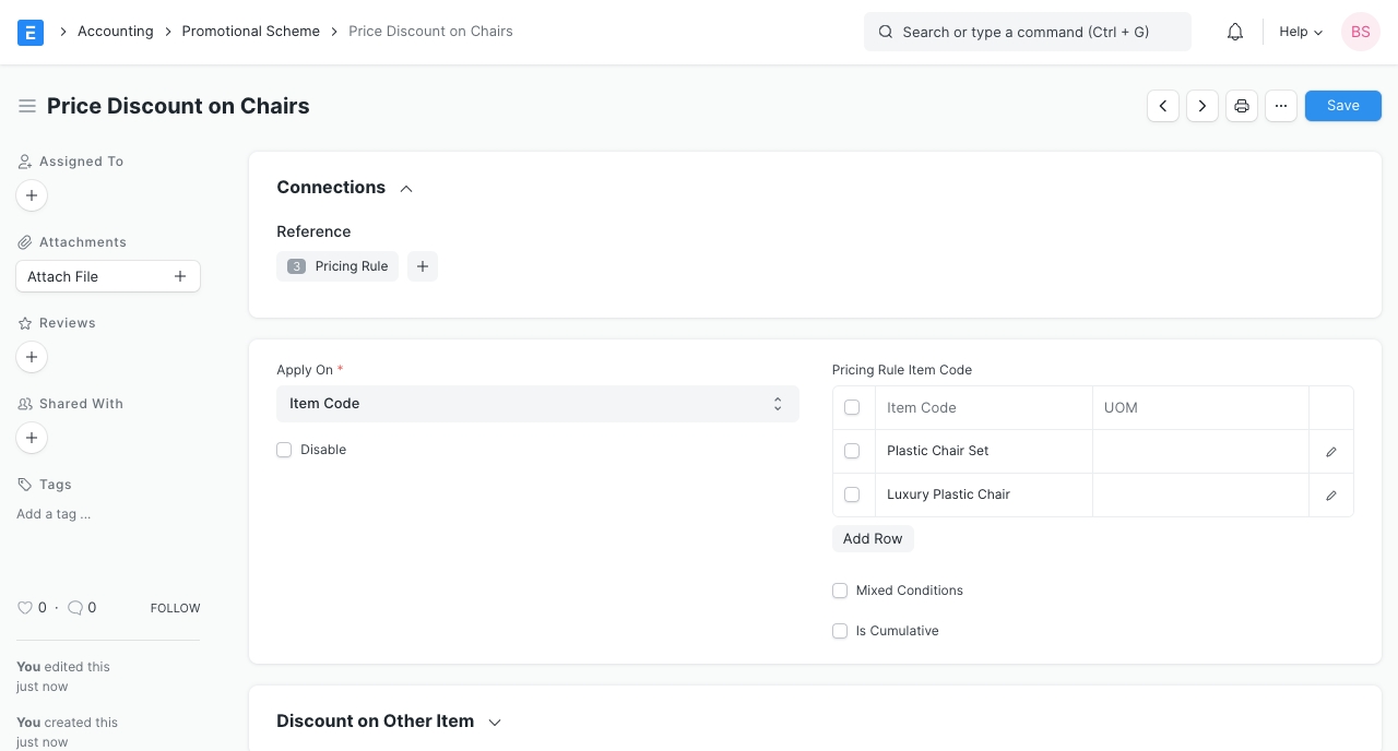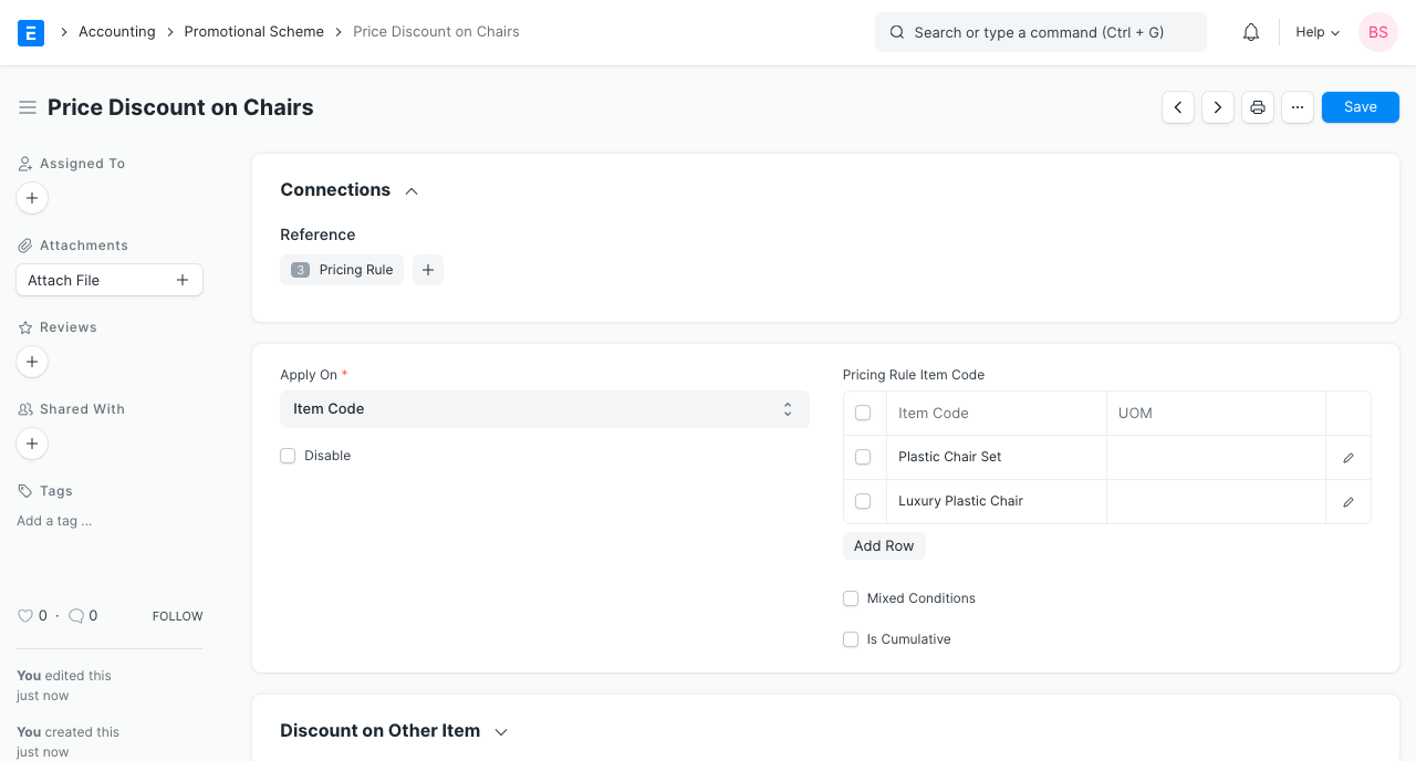 For example, set Item1 and Item2 in the 'Apply Rule On' table and set 'Apply Rule On Other' on Item3. Now, if the transaction has Item1, Item2, and Item3, the Pricing Rule will apply on Item3 since the first two Items were present in the transaction.