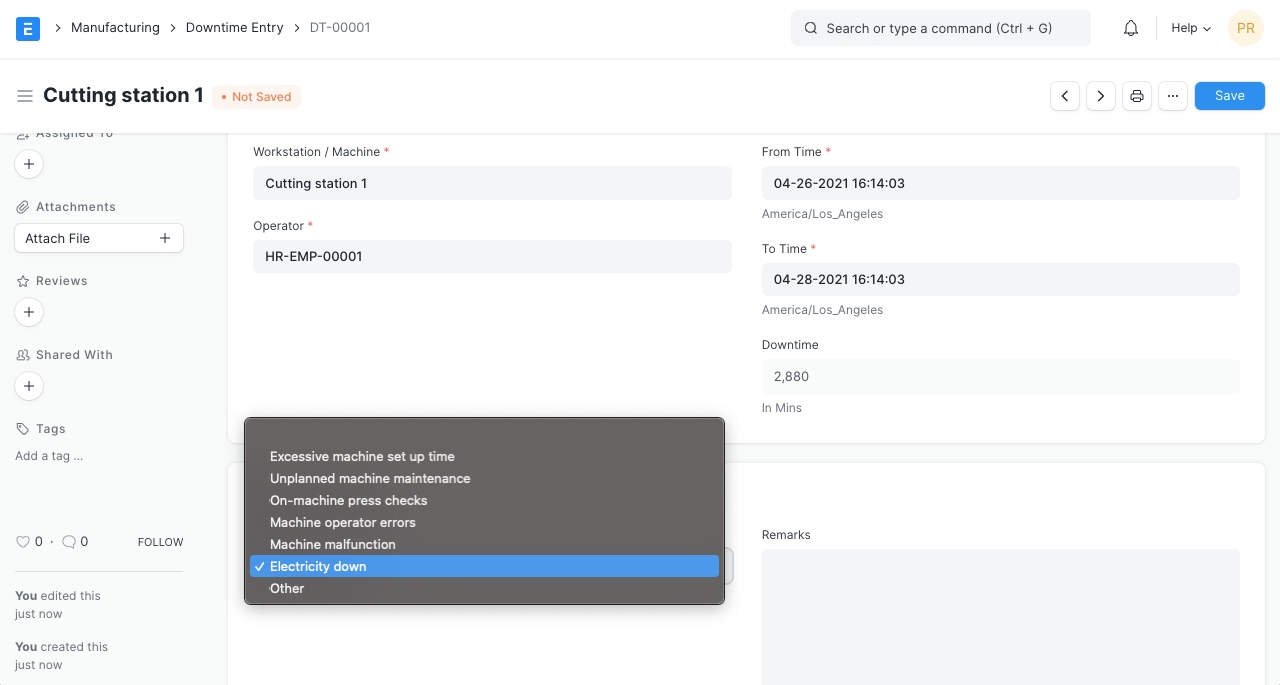 > Home > Manufacturing > Production > Downtime Entry