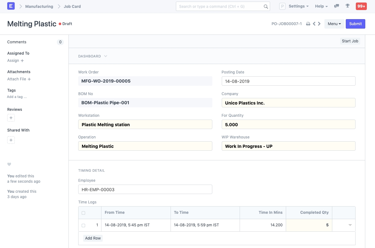 Employee assignment and timing detail will also be defined in Job Card. The time taken to do a job can be recorded. If multiple employees are working on the same Operation, add new job cards by clicking on the 'Create Job' Card button.