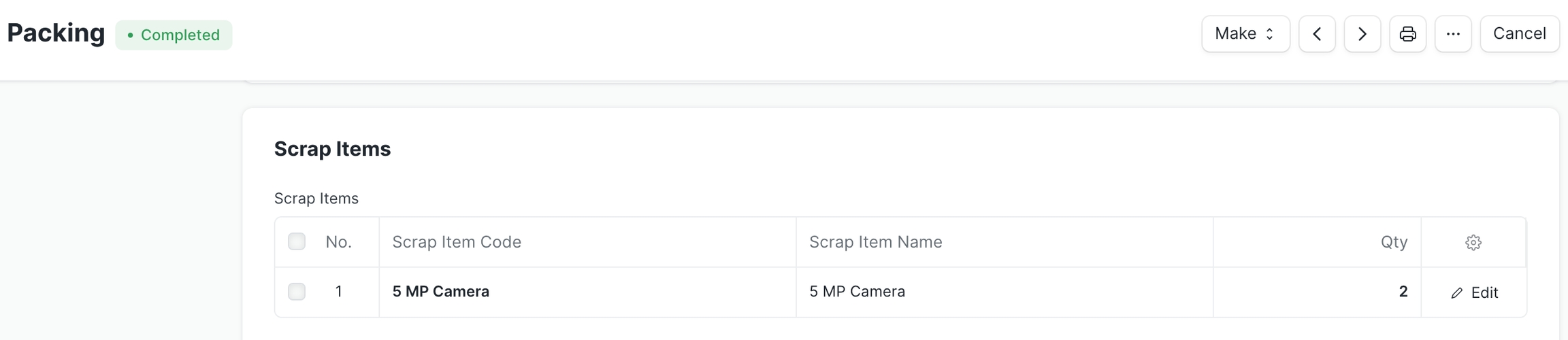 While completing the operations, there might be chances that some scrap materials will be produced. This scrap materials are required to be added in the inventory. For that user needs to put the details of the scrap items in the job card. User can also set the defective materials / broken materials in the scrap items table.