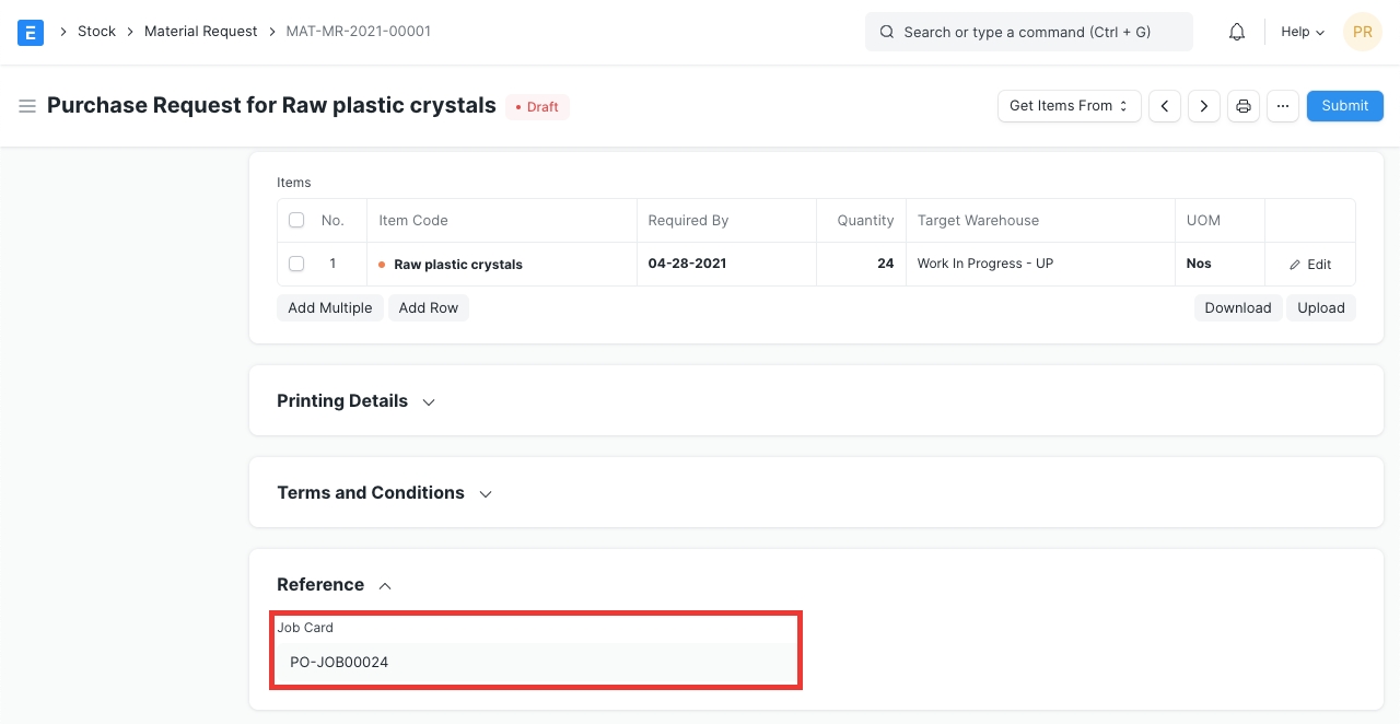 A Material Request will be raised from the Job Card as a basis/order to prepare raw material required for the manufacturing process. The Material Request raised will have its reference to the original Job Card number.