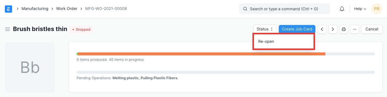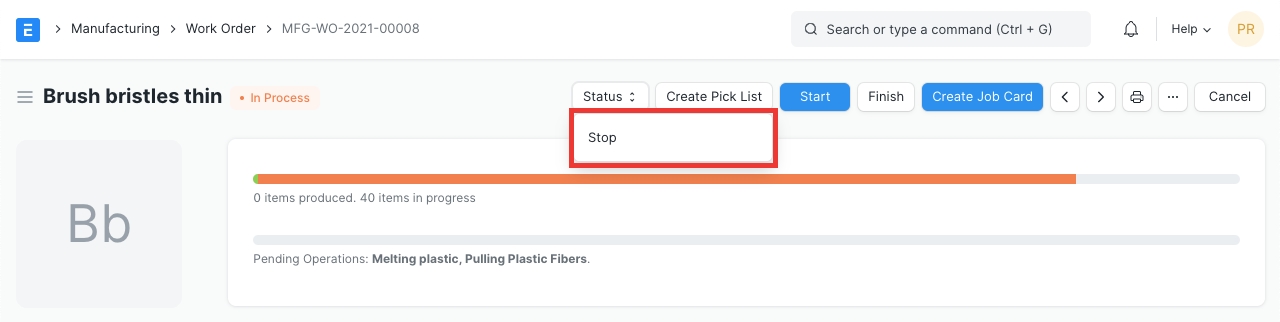 > Tip: You can also partially complete a Work Order by updating the Finished Goods stock creating a Stock Entry.