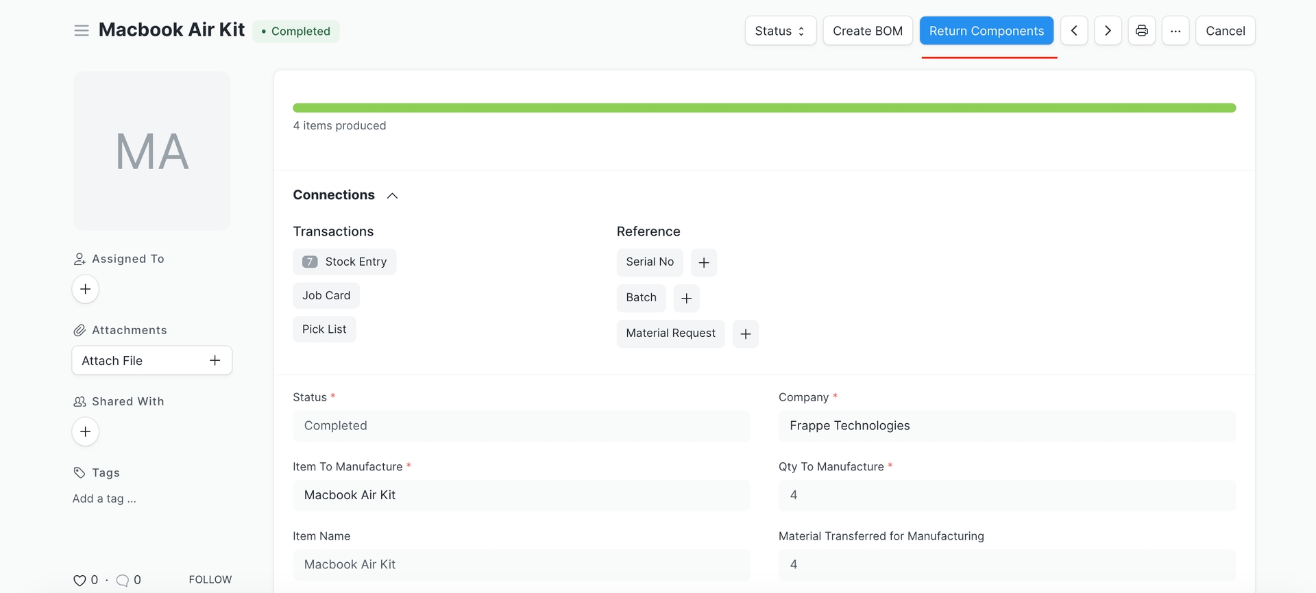 Allow Alternative Item: Sometimes when manufacturing a finished good, specific materials may not be available. For example, using plastic beads instead of plastic crystals. The finished good itself could be different. Ticking this checkbox will allow you the select an Alternative Item. To know more, visit this page.