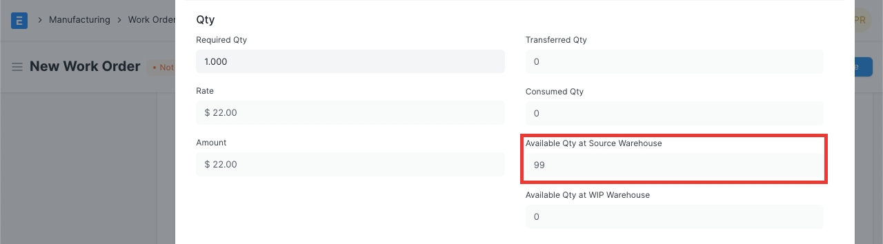 Transferred Quantity: Once the Work Order starts and Job Cards are run, items are transferred from the Source Warehouse to Work In Progress Warehouse. This field shows the quantity in the WIP Warehouse. Note that if you tick on 'Skip Material Transfer to WIP Warehouse', this column will not be updated.