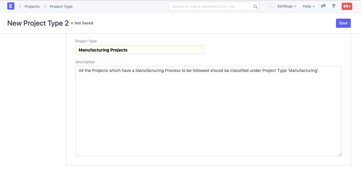 Internal Projects, External Projects could be examples of Project types and are already created in the system. You can choose to add more Project Types. This comes handy when you are reviewing the Projects, and you want to filter the information based on Project Types.