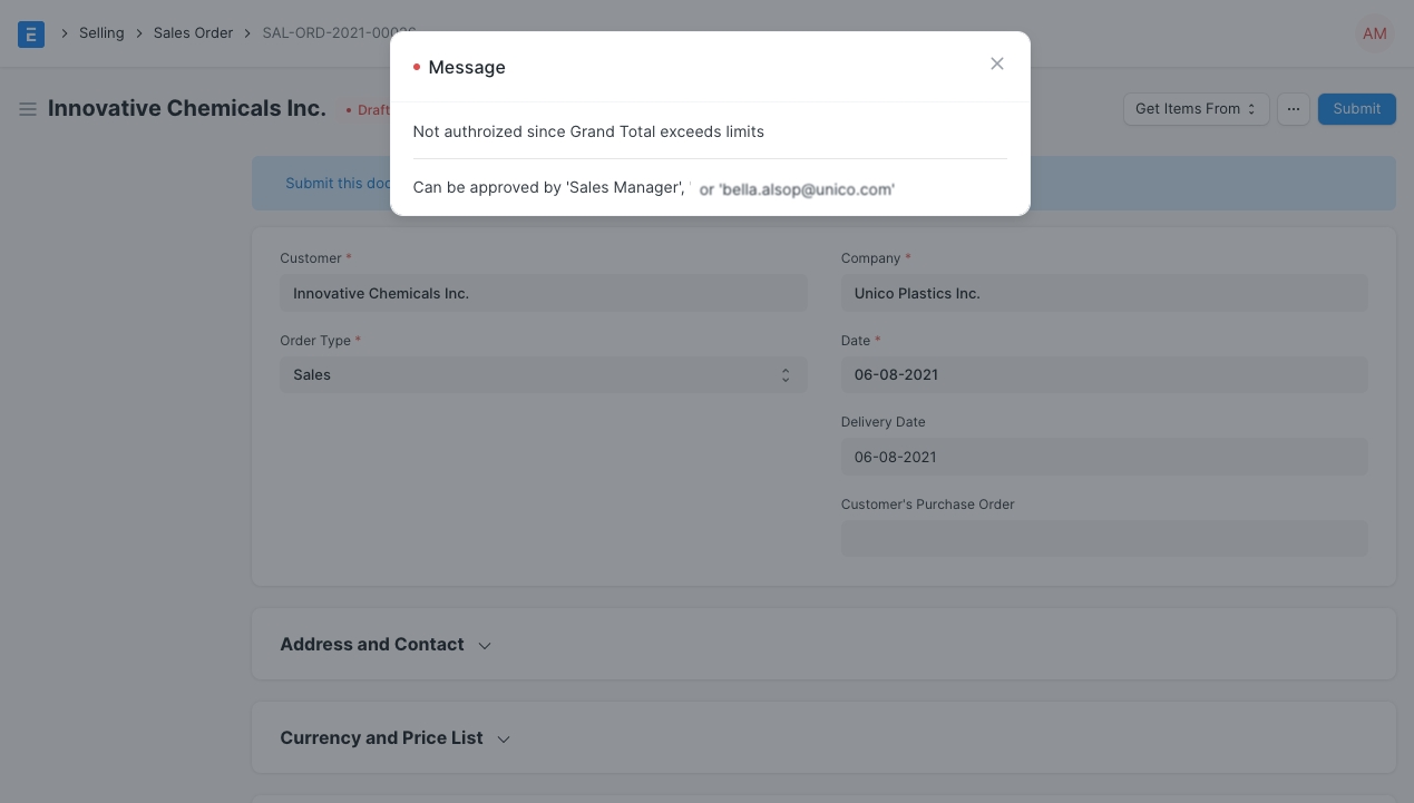 Example: If a Sales Order's Grand Total exceeds $1,000, then it should be verified/submitted by the Sales Manager only, even if the Sales User has "Submit" permission.