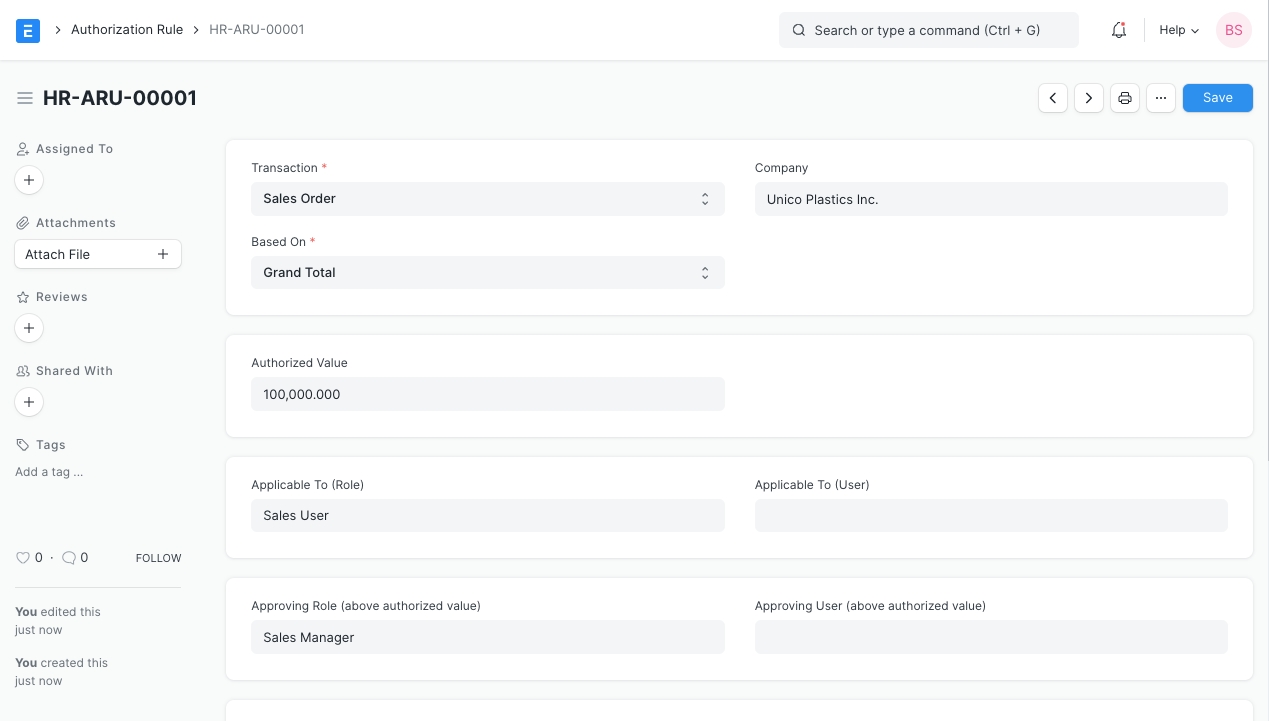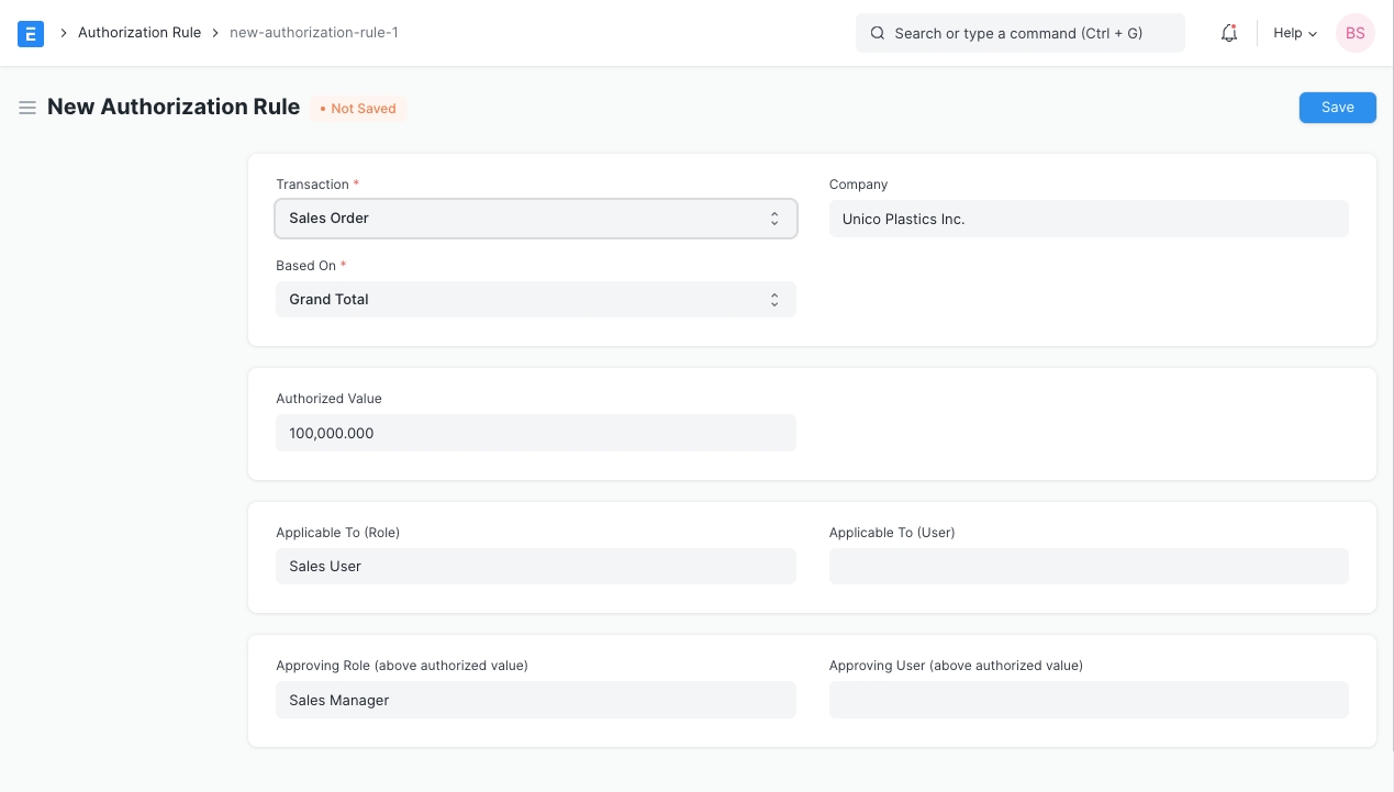 Assume that the Sales Manager needs to authorize Sales Orders, only if it's Grand Total value exceeds 10,000. If the Sales Order value is less than 10,000, then even the Sales User will be able to submit it. This means that the Submit permission of Sales User will be restricted only up to Sales Order of Grand Total less than 10,000.