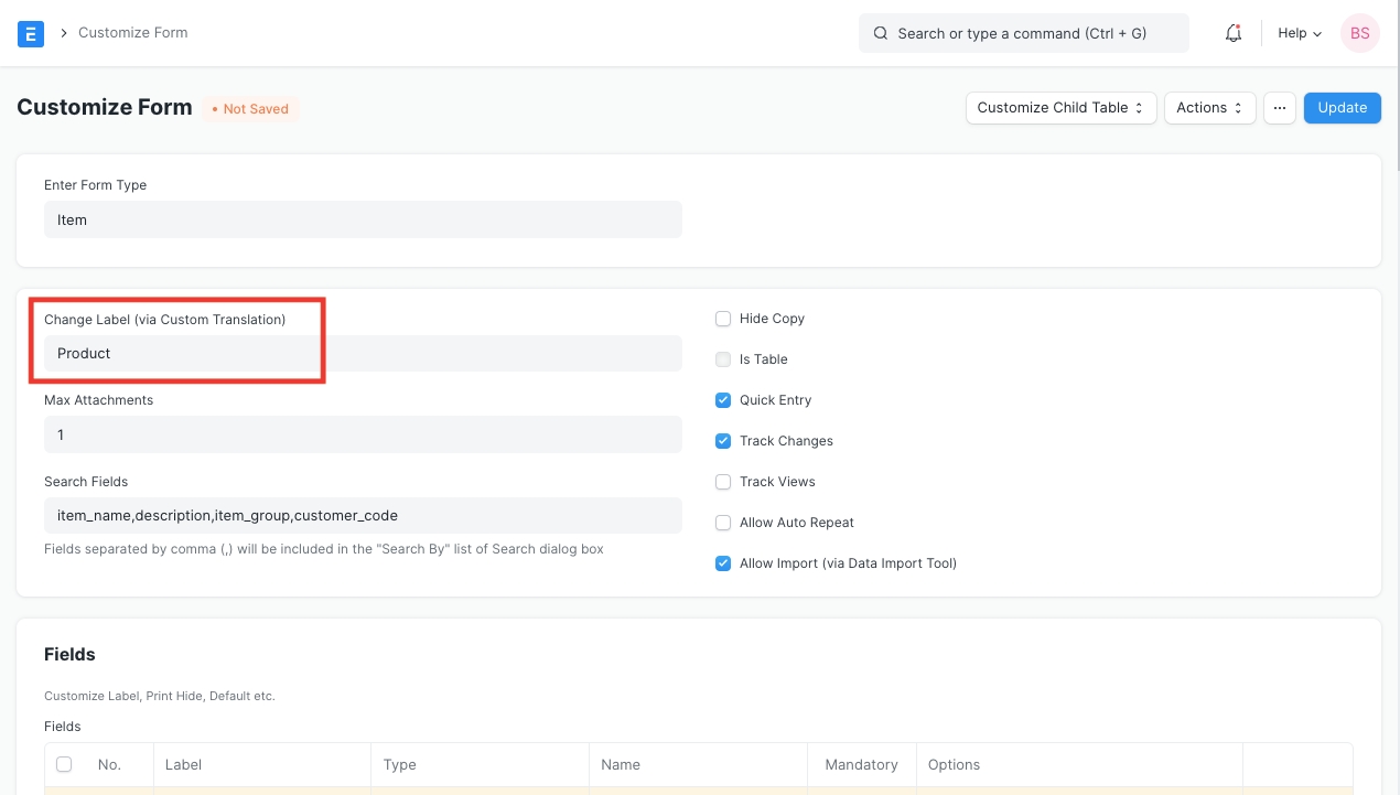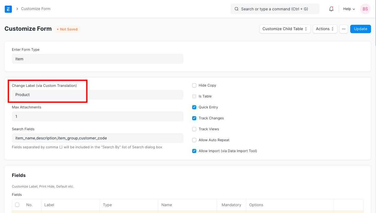 Change Label: This field gets fetched via Custom Translation. You can change the name of the field to suit your industry/language. E.g., if you are a services business and you want to change the Label from 'Customer' to 'Consumer', the same can be done via Custom Translation and the same shall be reflected here.