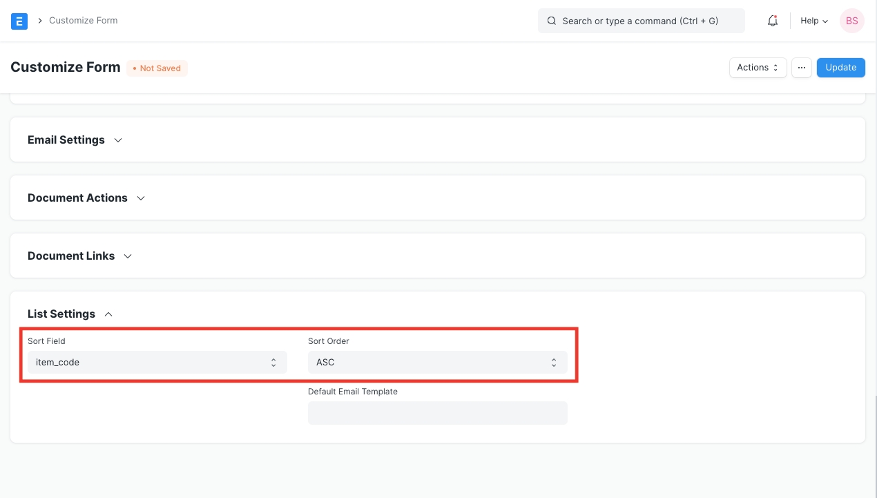 Sort Field: Records in any DocType List are generated based on the Field that you set at the Sort Field over here. E.g., for Items, if you want your list to be generated as per Item Name, you can configure the same here.