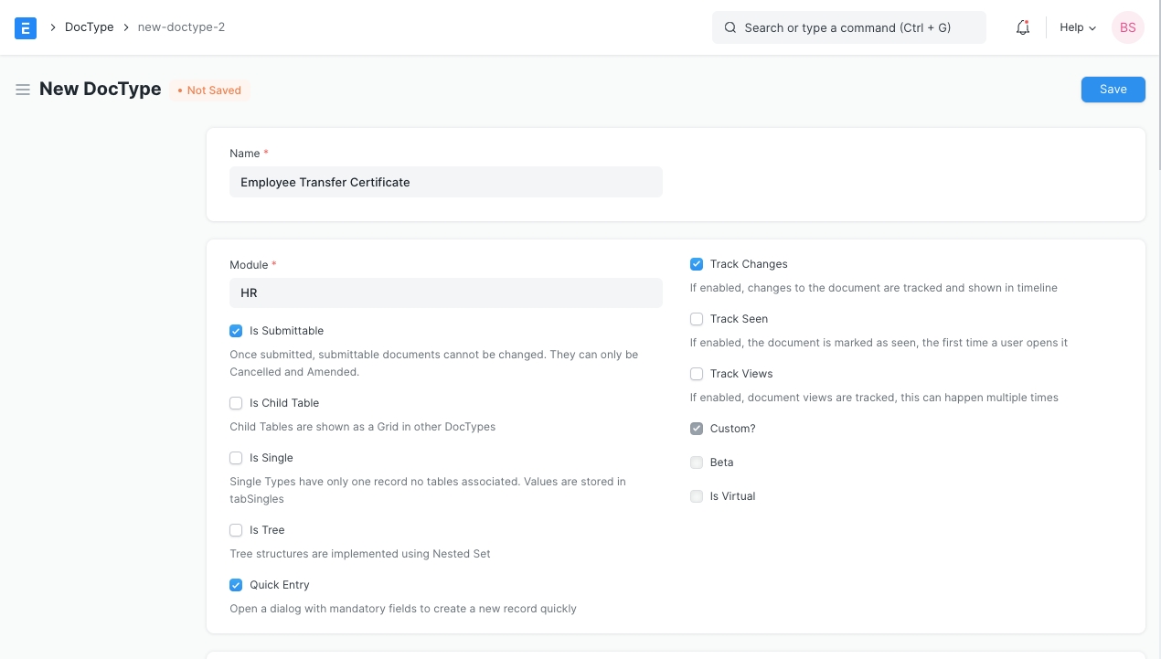 DocType Tree View Quick Entry: You can select if you want a Quick Entry to be made for this DocType. This will allow you to enter only a few mandatory details and save the DocType, so that a Quick Entry is made. For example, check Quick Entry in Journal Entry.