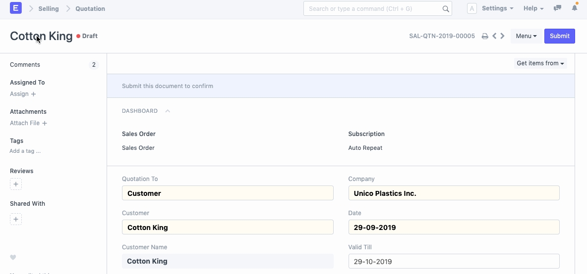 For example, the default title on a Quotation is the customer name, but if you are dealing with only a few customers and sending lots of quotations to each customer, you may want to customize.