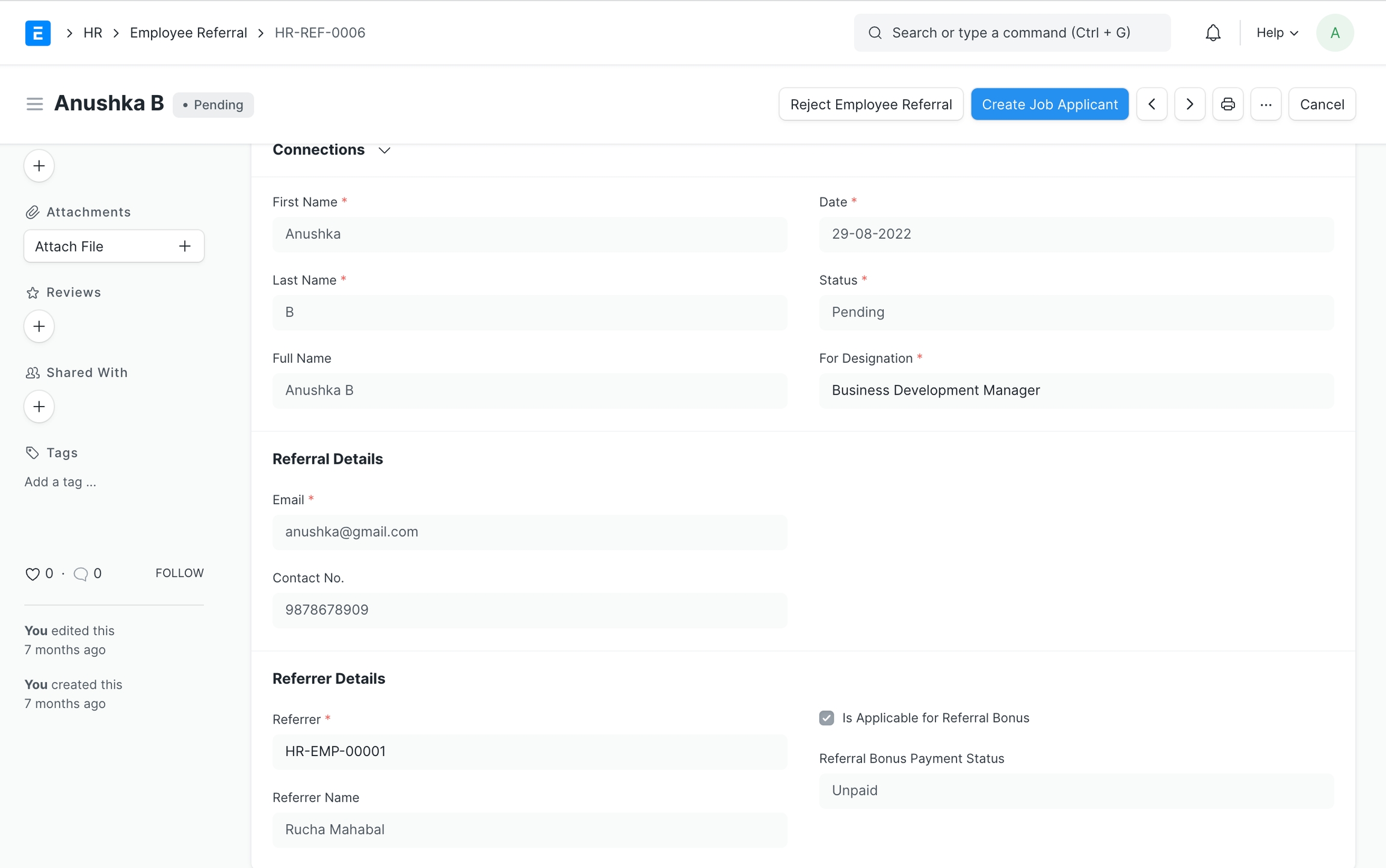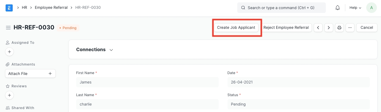 When you submit an employee referral document the initial status will be "Pending". After submitting the document, the "Create Job Applicant" button will appear at the top right corner.