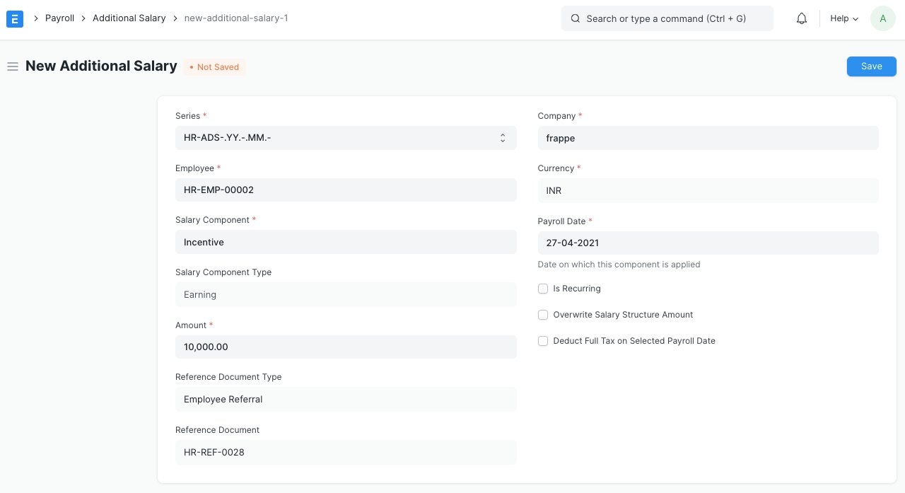 On Click, It will redirect you to the Additional salary form where you need to select Salary component and Payroll date and after that, you need to save and submit the document.