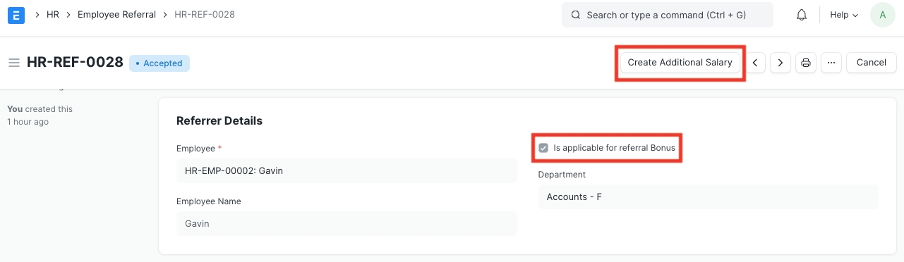 For the Referral bonus, you need to check the "Is applicable for referral bonus" checkbox before submitting the document. After submitting the document, the "Create Additional Salary" button will appear at the top right corner, if the status is "Accepted".