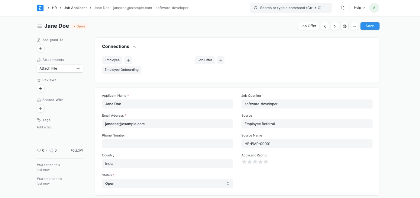 In Frappe HR, you can maintain a list of people who have applied against a particular Job Opening.