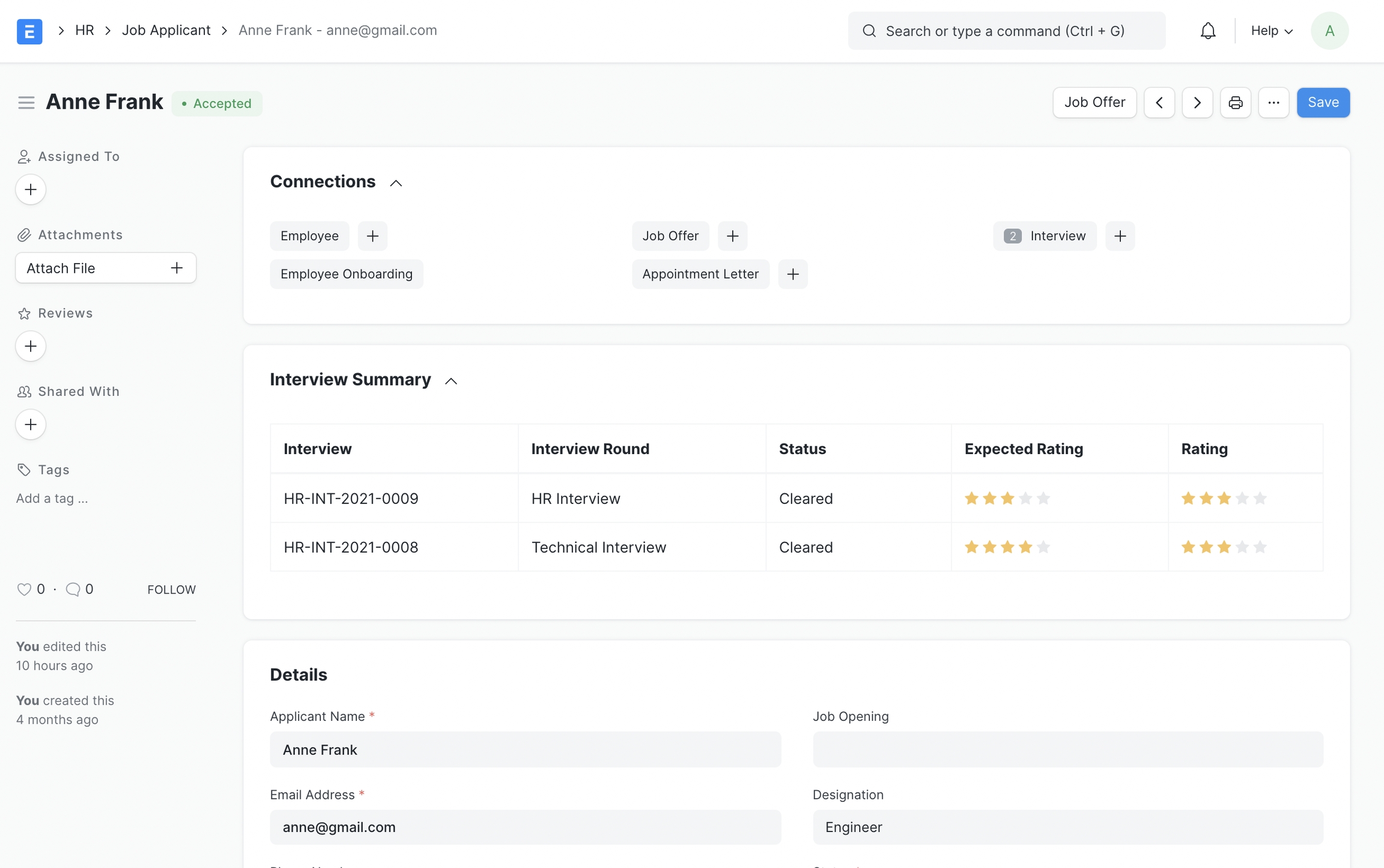 After creating Interviews, you can easily track them within the Job Applicant dashboard. This enables you to compare all the interviews conducted with the applicant and evaluate their overall performance to make an acceptance decision.